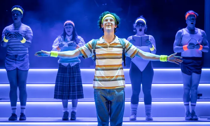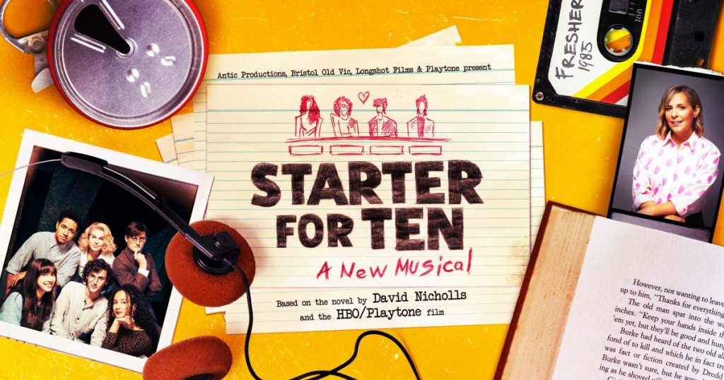 Starter for Ten is adapted from David Nicholl’s book of the same name, taken from the infamous catchphrase of the show. It follows 18 year-old protagonist Brian Jackson, and has already been made into a film in 2006 starring James McAvoy. It makes for an intriguing musical premise, given that the setting is so recognisable, and we start out with Child Brian, watching University Challenge in his pyjamas on the sofa. In a blink, it’s 1985 and he’s grown up, lost his father and left his best friend Spencer in working-class Southend, arriving at Bristol University desperate to join the University Challenge team and make friends amidst the rugby lads, workers’ rights campaigners, and academics. We meet Rebecca (Eubha Akilade), a sparky Glaswegian activist, and Alice (Emily Lane), a beautiful blonde who transfixes him immediately, and who he accidentally gets onto the team, leaving him as reserve. Predictably, he eventually makes it on himself and we watch him and the team as they progress, while he tries to navigate keeping in touch with his mum (Mel Giedroyc), his new friendships with Rebecca and his teammates, and his potential relationship with Alice. Adam Bregman (Brian) has a gorgeous soulful voice, as does Akilade (Rebecca). Lane’s voice is also very pretty, although unfortunately when I saw it, her microphone was turned up a little too much and her character’s number ‘For the Story,’ was a little difficult to listen to when she was belting towards the end.