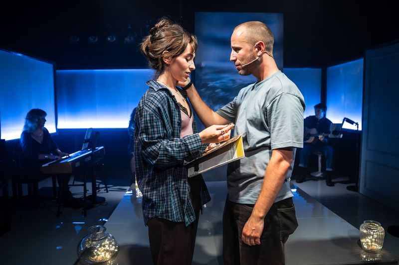 The Ustinov Studio is a compact space which seats a hundred and twenty, and feels comfortingly intimate. There’s a raised square in the middle of the stage, with horizontal rectangles on the back and sides, interrupted at the back with a semi-transparent screen through which the characters can be seen. Set and costume designer Ethan Creek writes in the programme about his intention to create a sense of transience, which he certainly does; it is left to the actors to bring the dreamlike staging back to emotional reality, with Martha Kirby and Guy Woolf starring as Cathy and Jamie. Kirby begins the show, reeling with shellshocked grief at the end of her relationship (‘Still Hurting’); she has a huskier, more soulfully rounded voice than Kendrick which is lovely. Woolf’s Jamie, by contrast, is immediately high energy and expressive, with more chaotic flair than Jordan’s vocals. Jamie absorbs the initial sombreness and pain of the first song by bounding onstage afterwards, fresh with the excitement of meeting Cathy five years ago (‘Shiksa Goddess’), and we’re off. His delirious song as his career takes off and he moves in with her (‘Moving too Fast’) is vigorous and great fun. There is quite a bit of deliberate unsynchopation from Woolf, though I might have noticed this more because Jordan’s version is quite unexperimental; he and Kirby both option up throughout. ‘The Schmuel Song,’ in which Jamie tells Cathy a story he’s written about her, is the first time we see their tender and convincing chemistry, and her unbridled admiration of him pairs well with his excited energy.